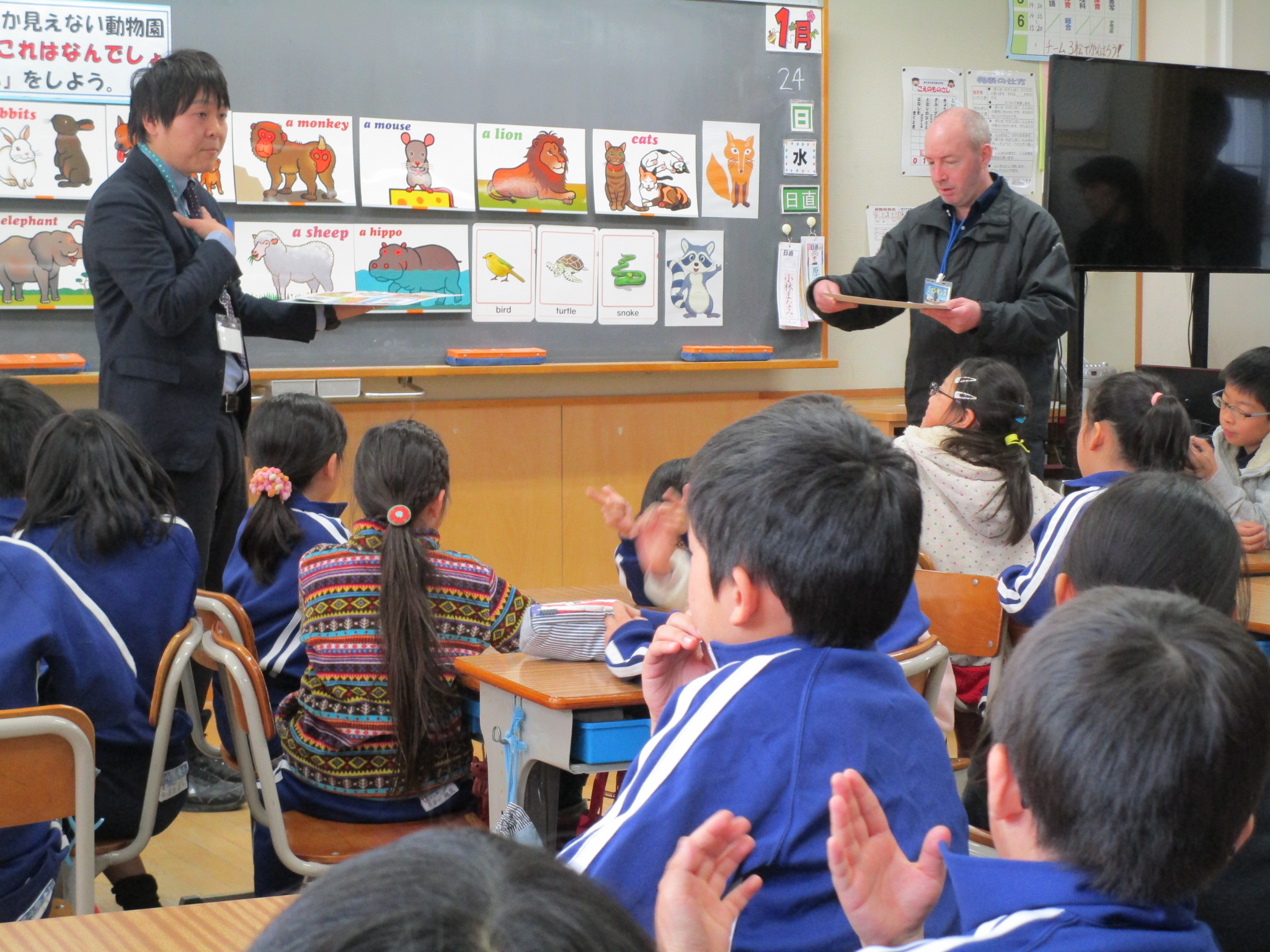 市内外小・中学校から27人の先生方が参加し、荒川東小学校の全先生方と一緒に研修に取り組みました。来年度から始まる中学年の外国語活動の授業提案として大変素晴らしい公開授業が行われました。授業はアルファベットがふんだんに出てくる英語の歌で楽しい雰囲気づくりから始まり、動物の語彙の慣れ親しみをピクチャーカードで行うなど楽しい活動が目白押しでした。ALTと学級担任の小林先生のチームワークの良い進行で子どもたちの興味は大きく膨らみます。事前に児童が作ったペーパーの動物を使って、「ちょっとしかみえない動物園」をグループで作りました。その動物園を持ち運びながら別のグループにWhat's this? と動物の体の一部分を見せながらクイズを出す活動が行われました。 また、絵本教材Story Books "In The Autumn Forest"を使って児童たちと What's this? Rabbit! などやりとりをしながら、絵本を楽しんでいました。